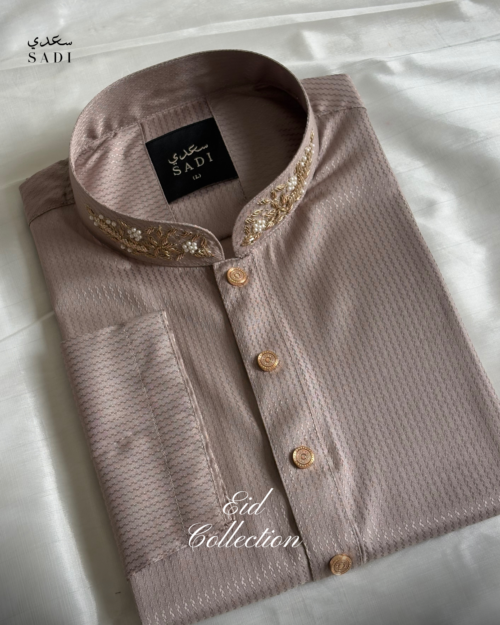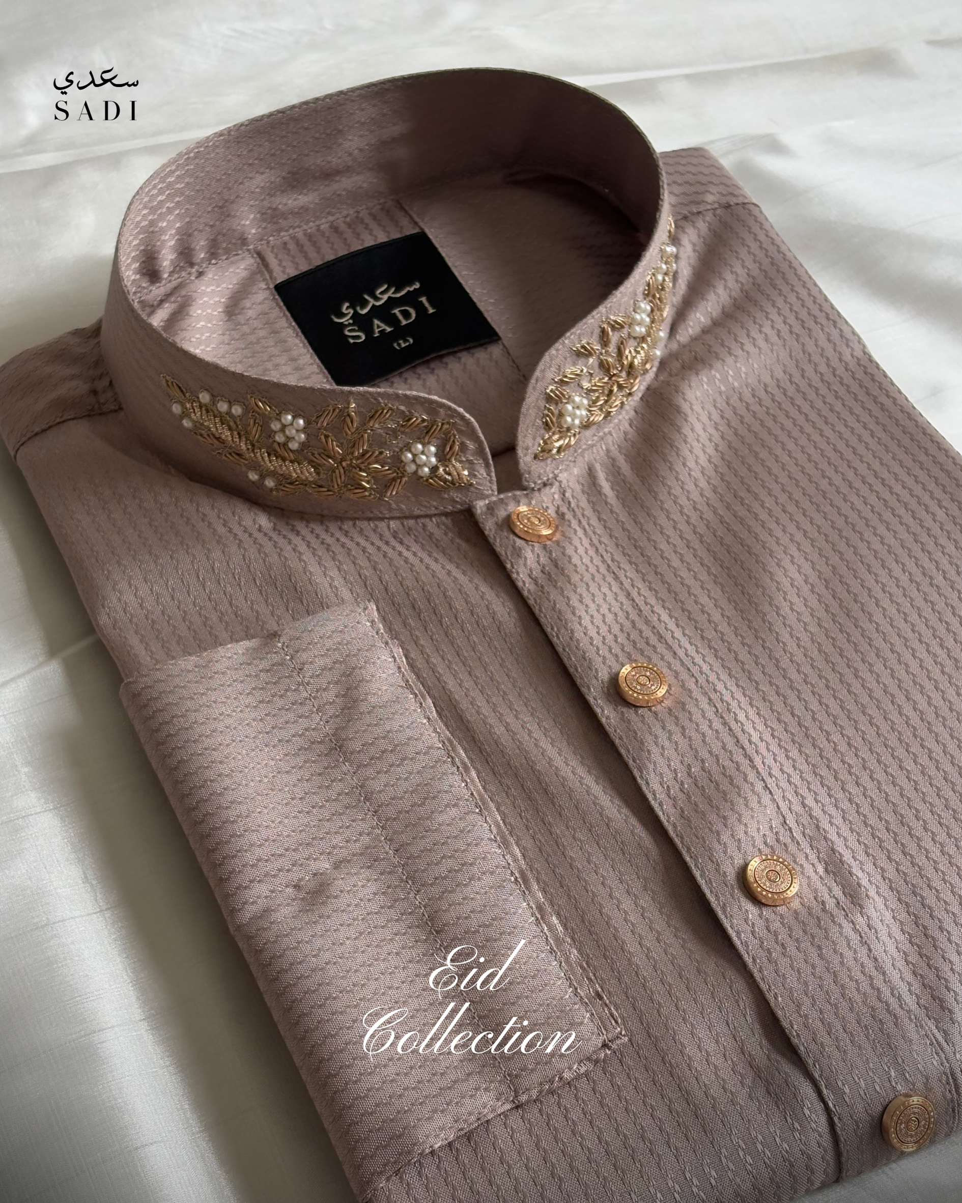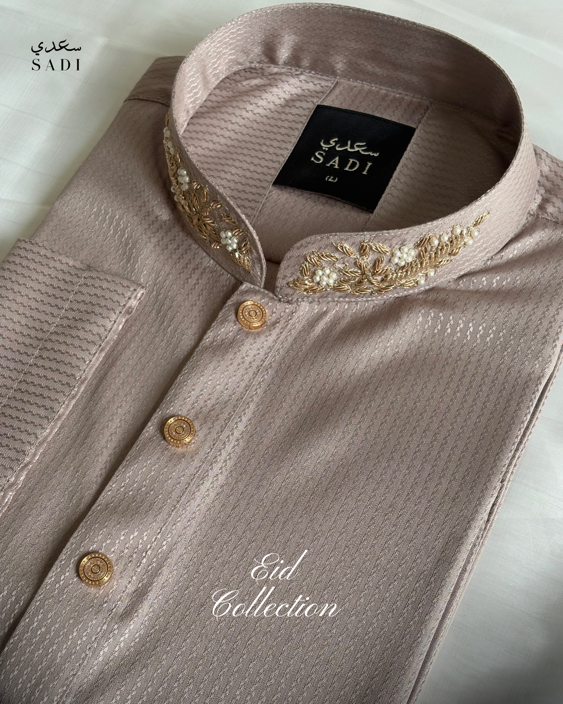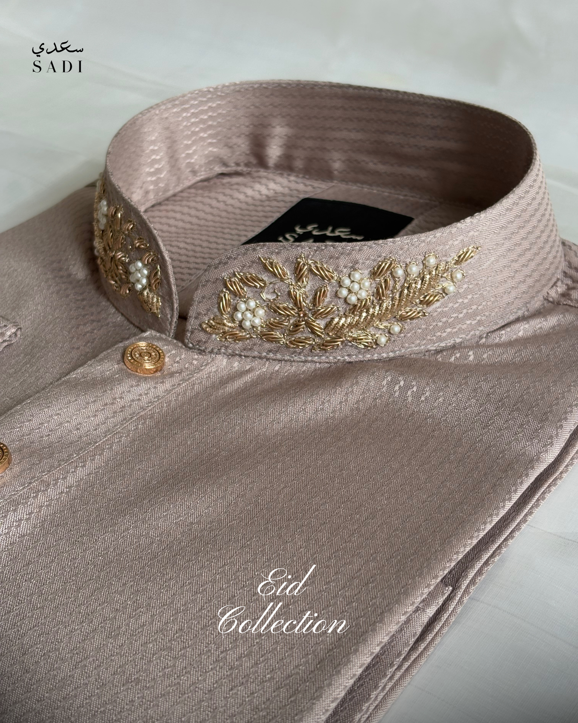 The highlight lies in the gorgeous zardozi handwork on the collar, featuring champagne-gold threads and pearl accents .